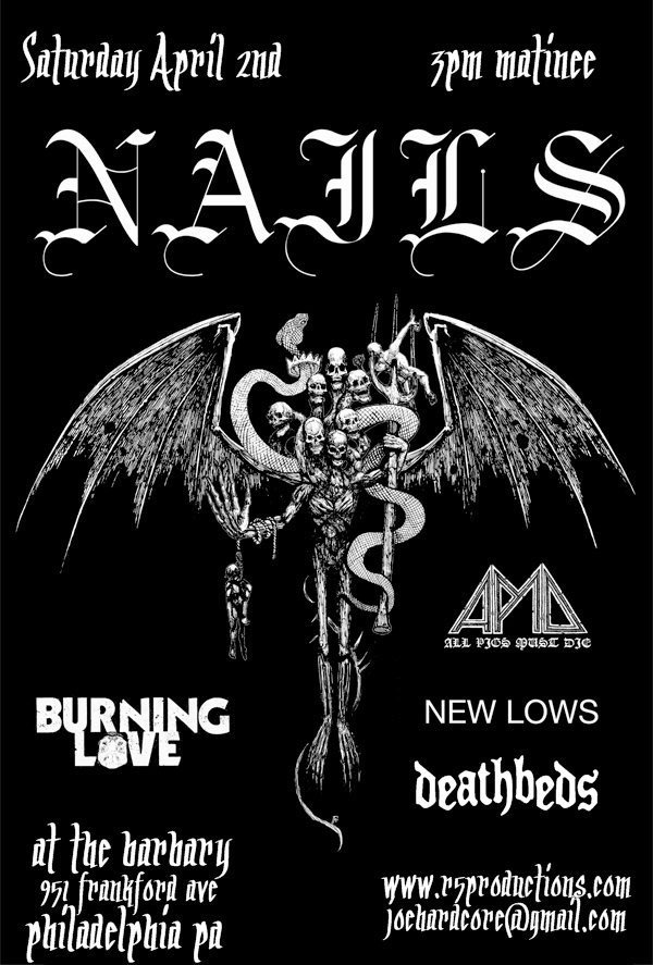 Saturday, April 2, 2011, James and I zipped over to The Barbery, located at 951 Frankford Ave., Philadelphia, PA to catch Nails, All Pigs Must Die, Wormrot (who got added to the bill last minute as the Philly Parking Authority jacked their van), New Lows, and Deathbeds.