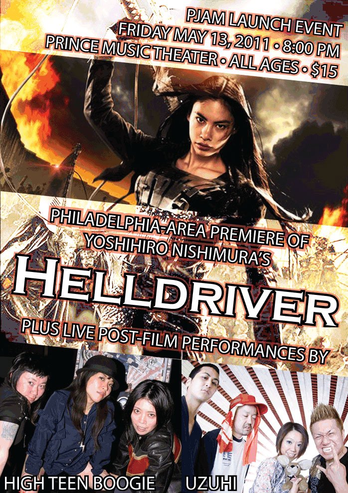 The film was followed with live performances by popular J-‐rock bands, Uzuhi and High Teen Boogie. Uzuhi combines traditional Japanese folk music with power ballad anthem rock, sugary Anime theme songs, skank inducing ska, and lightning fast punk rock while High Teen Boogie’s all female blues rock trio is reminiscent to the iconic 5,6,7,8’s from Kill Bill Volume 1. This event marks Helldriver’s official Philadelphia premiere and is being held in conjunction with the international charity screening tour, Splatter Matters.